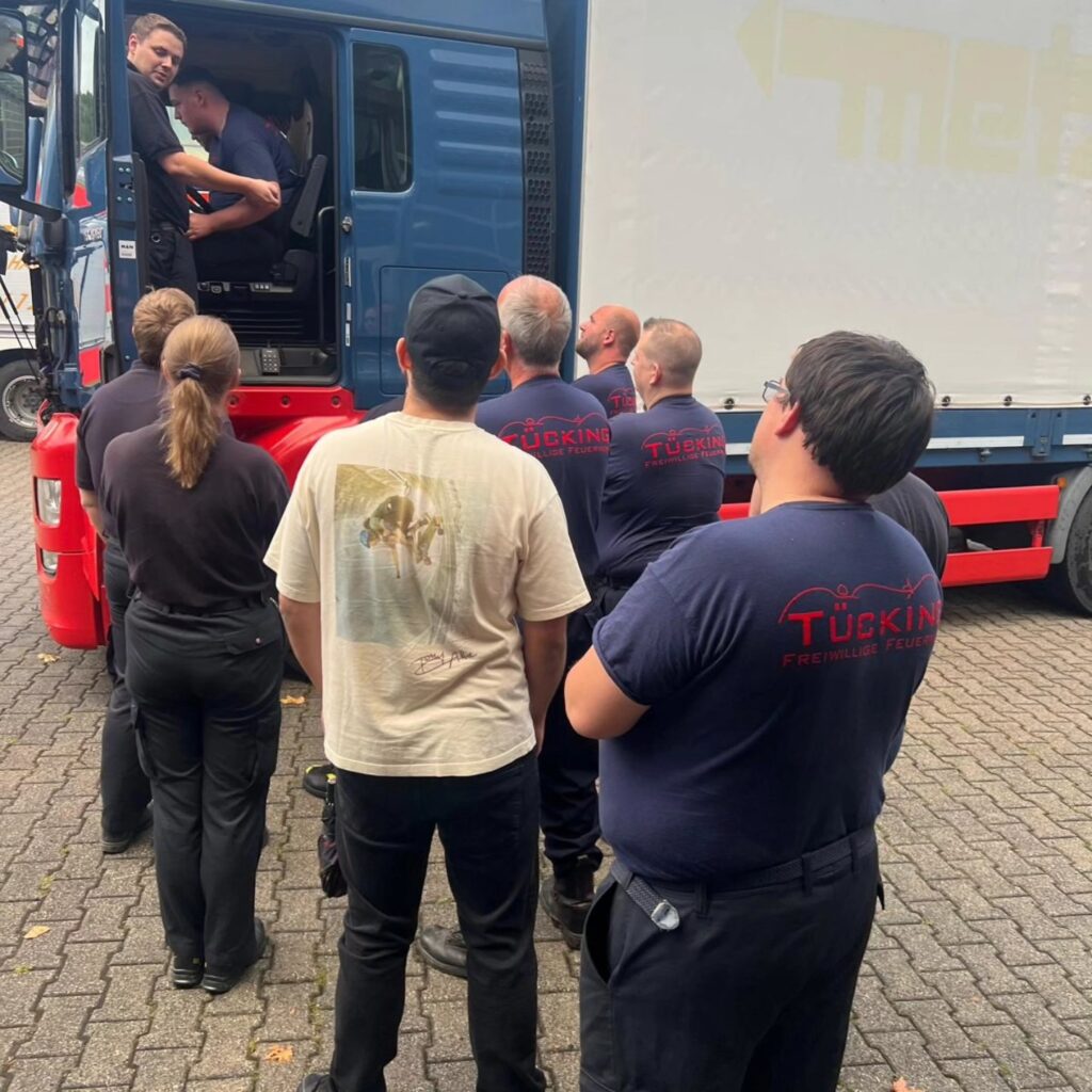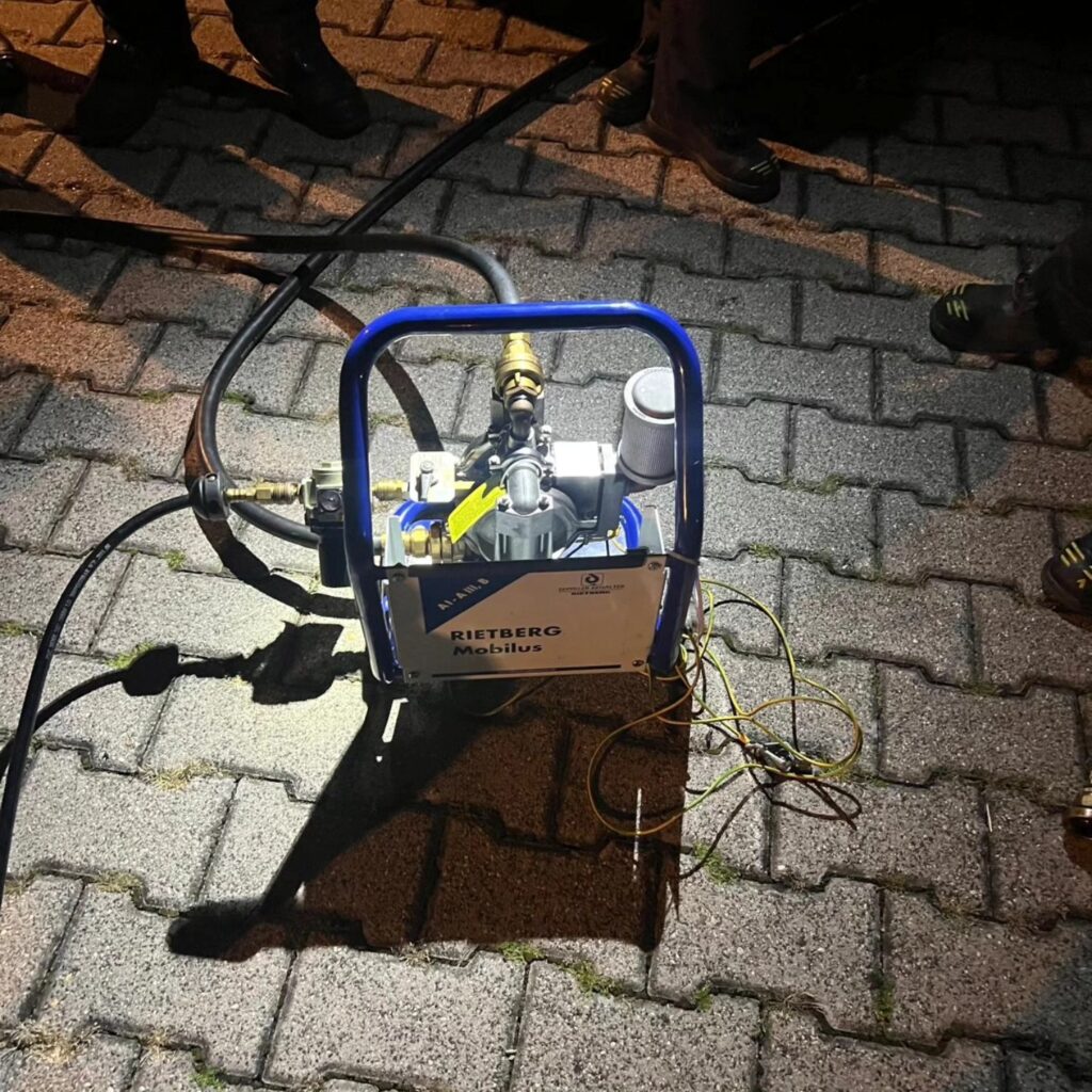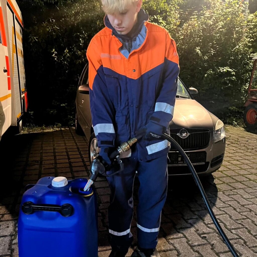 Anschließend schauten wir uns noch unsere Druckluftmembranpumpe an, die auf dem Rüstwagen verlastet ist. Die Pumpe ist dazu da, um Kraftstoff umzustellen, wenn sich beispielsweise ein LKW den Tank aufgerissen hat, um ihn anschließend mit der Pumpe zu leeren. So konnten wir unseren neuen Kameraden die Handhabung zeigen und die erfahrenen Kameraden können noch einmal üben.