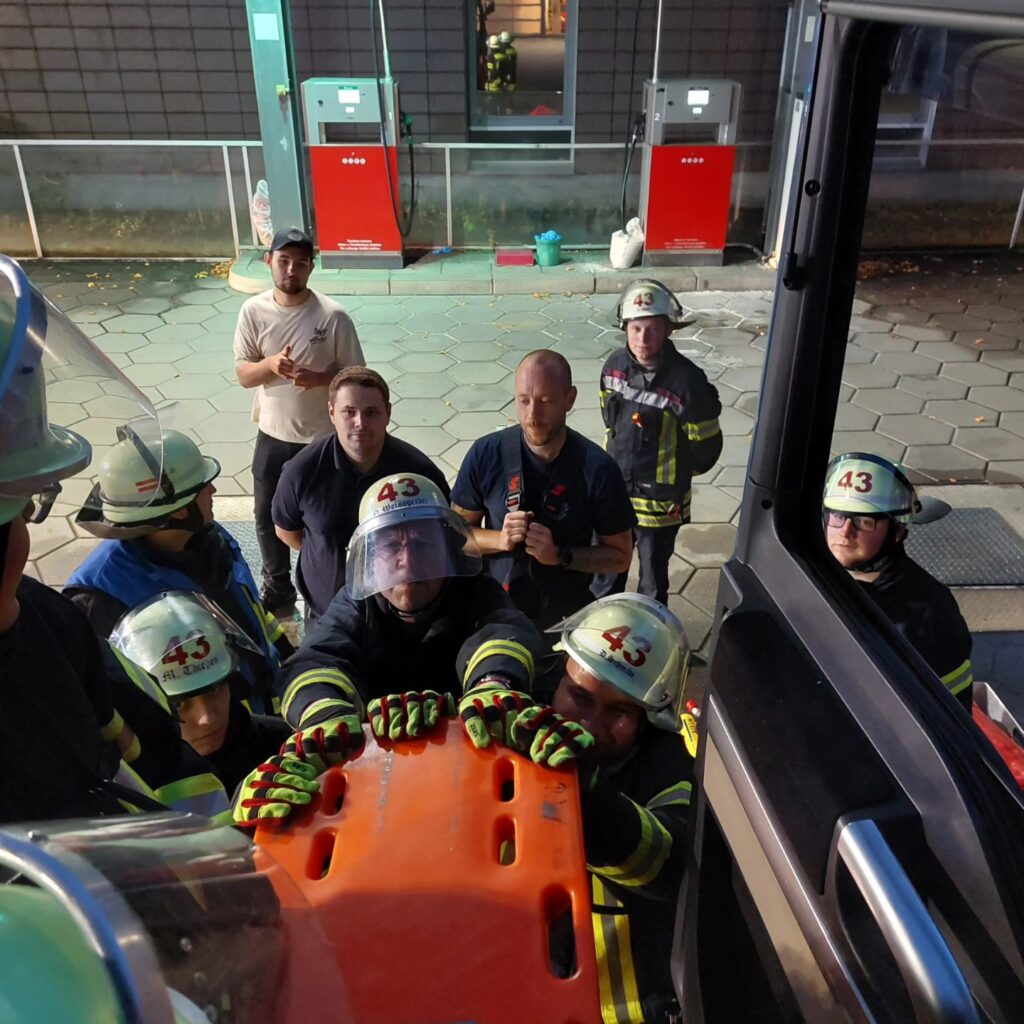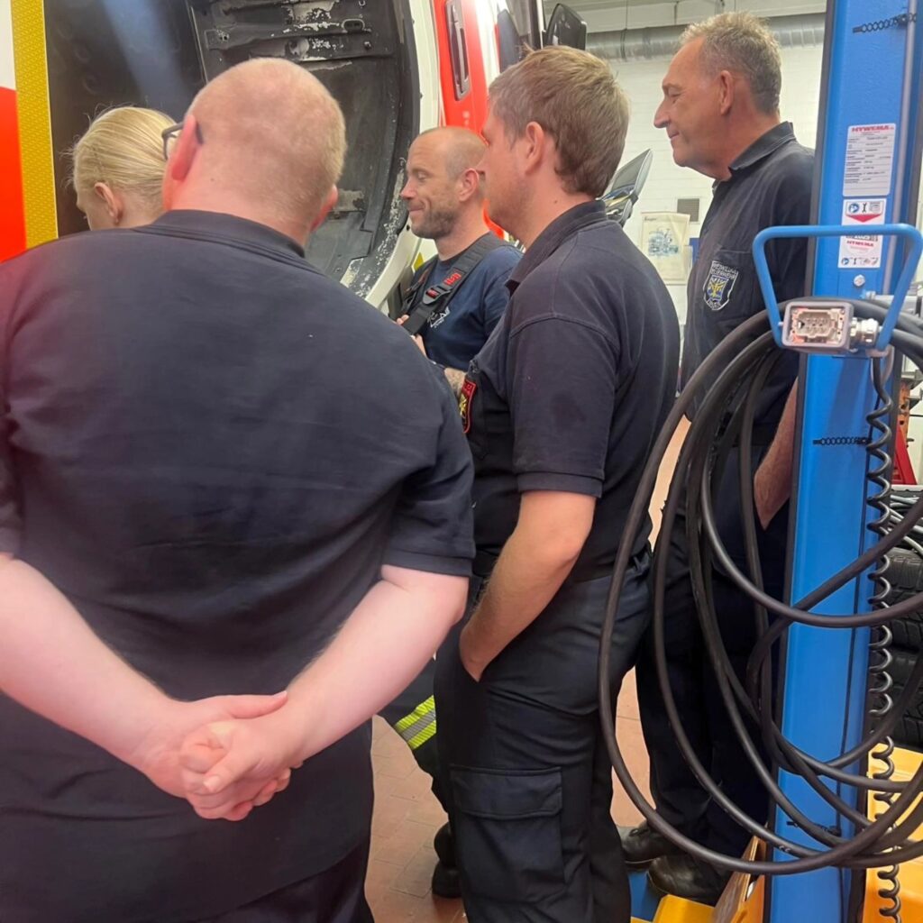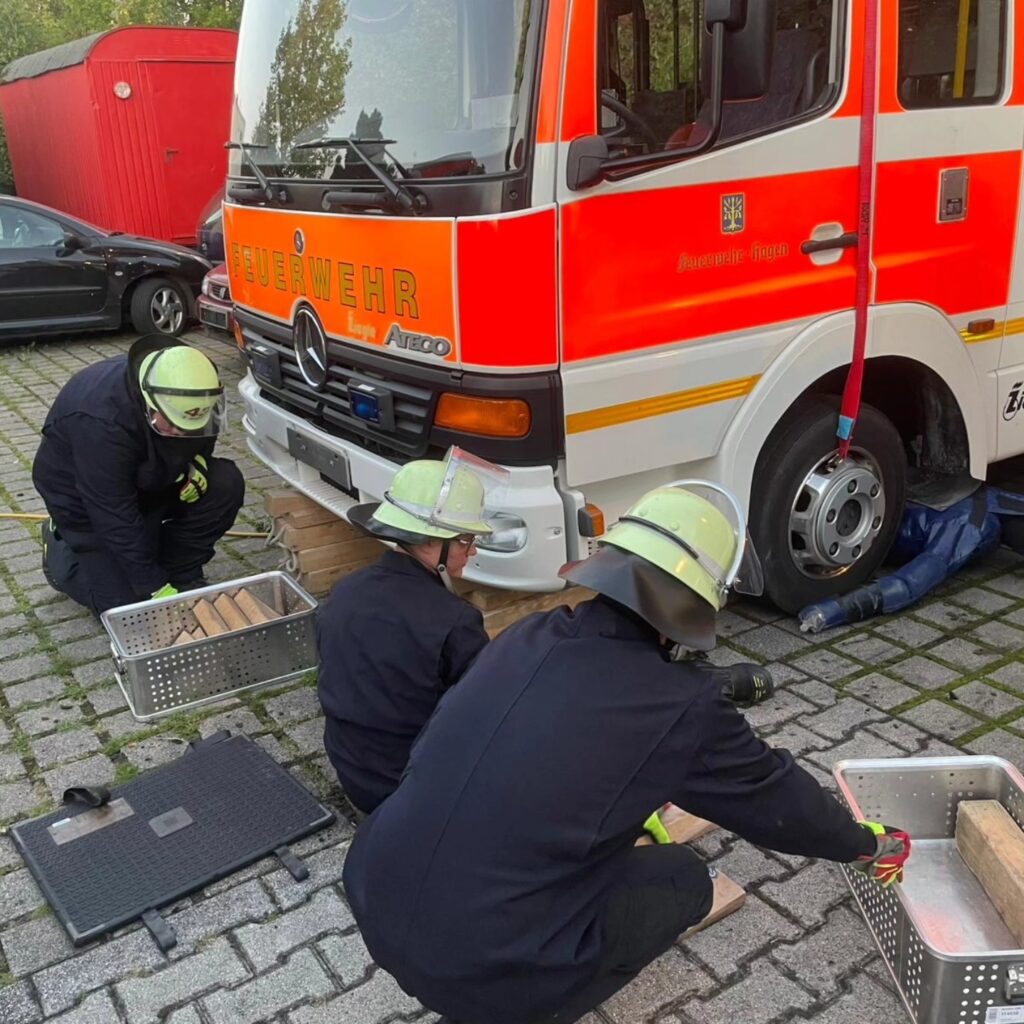 Anschließend schauten wir uns noch unsere Druckluftmembranpumpe an, die auf dem Rüstwagen verlastet ist. Die Pumpe ist dazu da, um Kraftstoff umzustellen, wenn sich beispielsweise ein LKW den Tank aufgerissen hat, um ihn anschließend mit der Pumpe zu leeren. So konnten wir unseren neuen Kameraden die Handhabung zeigen und die erfahrenen Kameraden können noch einmal üben.